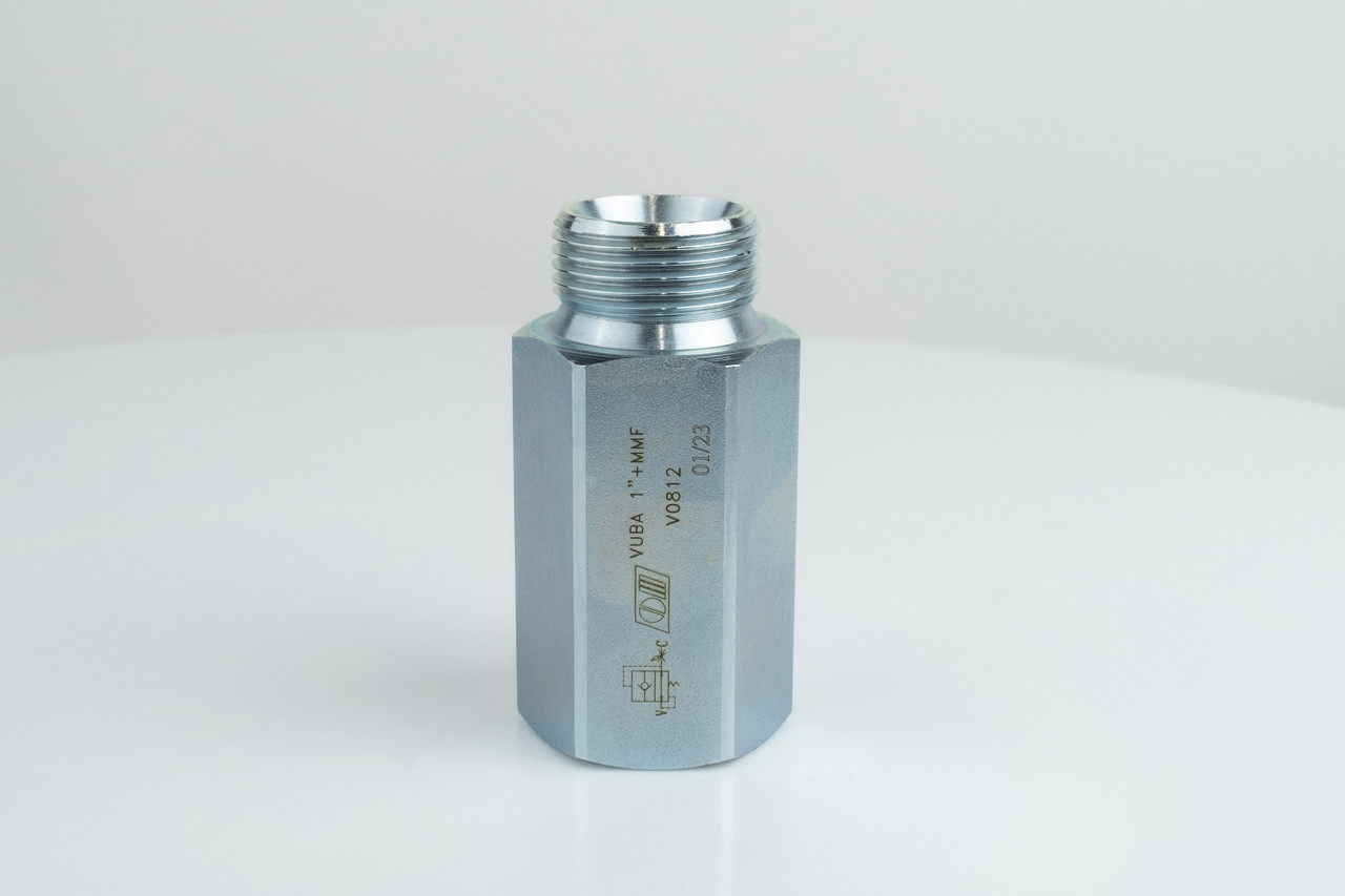 Аварійний клапан VUBA 1" + MAN.MF використовується для запобігання неконтрольованому падінню вантажу у разі розриву трубопроводу (шланга). Він не допускає витоку робочої рідини при обриві гідролінії. Клапан перекриває потік, що виходить з циліндра, фіксуючи вантаж на своєму місці. У разі перевищення заданих налаштувань (реакційний потік) клапан блокує потік. Цей клапан рекомендується використовувати разом із клапаном регулювання потоку. Корпус клапана виготовлений із сталі.